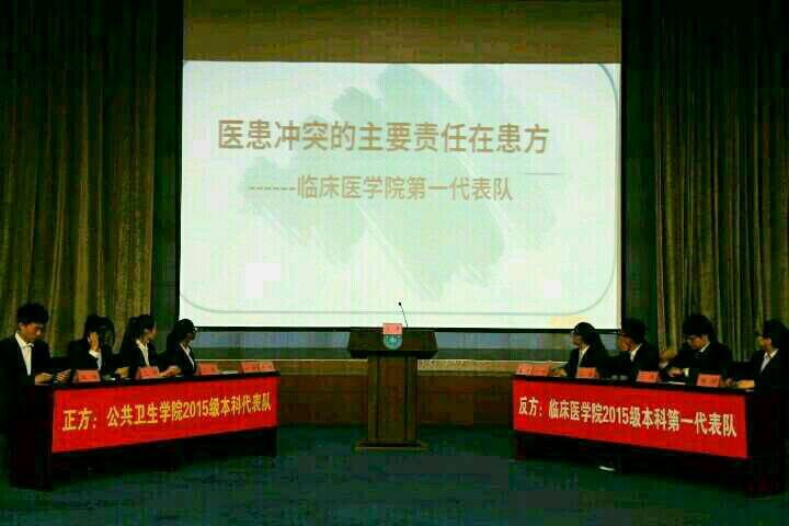 正方公共卫生学院2015级本科代表队与反方临床医学院2015级本科第一代表队围绕“医患冲突的主要责任是在医方还是在患方”展开了激烈辩论。辩手们精辟的言辞、严密的逻辑和充分的论证,不时赢得观众的阵阵掌声。济宁职业技术学院高职教育研究所所长、济宁市首届汉字小英雄电视听写大赛主任评委、全国语言文字先进工作者刘向红教授作了点评,对本场辩论赛给予高度评价。最终,临床医学院第一代表队技高一筹,夺得冠军;公共卫生学院代表队获得亚军;护理学院代表队和精神卫生学院代表队获得季军;临床医学院第一代表队三辩刘大琪同学荣获“最佳辩手”称号。临床医学院副院长李建军及出席辩论赛决赛的有关部门领导为获奖代表队和个人颁奖。党委宣传(统战)部、学生工作处和相关学院负责人,2015、2016级本科生代表,共五百多人观看辩论赛。