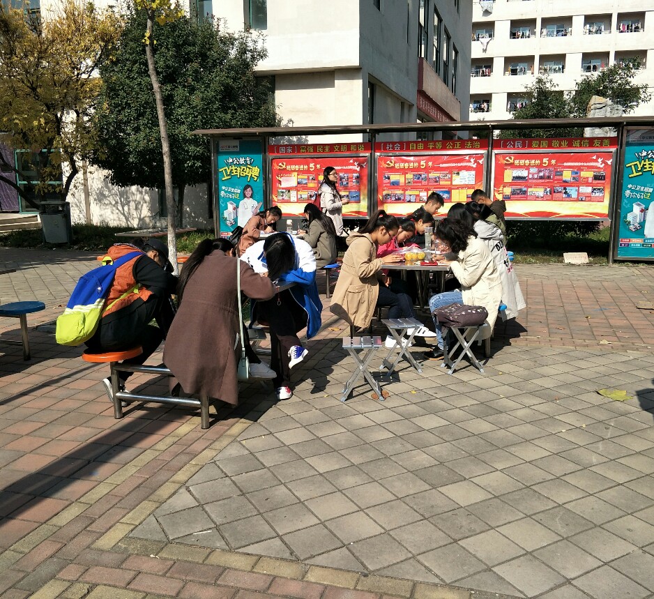 此次活动由全体17级全体新生以及有意向的15、16级同学参加,地点在南北餐厅之间,在卫生部部长、副部、干事主持以及秘书处、办公室干事的共同努力下顺利完成。6:00卫生部干事一到达场地就开始热火朝天地准备布置,搭建帐篷,摆放桌子,扯电线,并向北餐厅借了7张餐桌。8:00活动正式开始。虽然冷风瑟瑟,但仍抵挡不住新生们的热情,在11点左右,活动达到高潮,活动现场十分热闹。