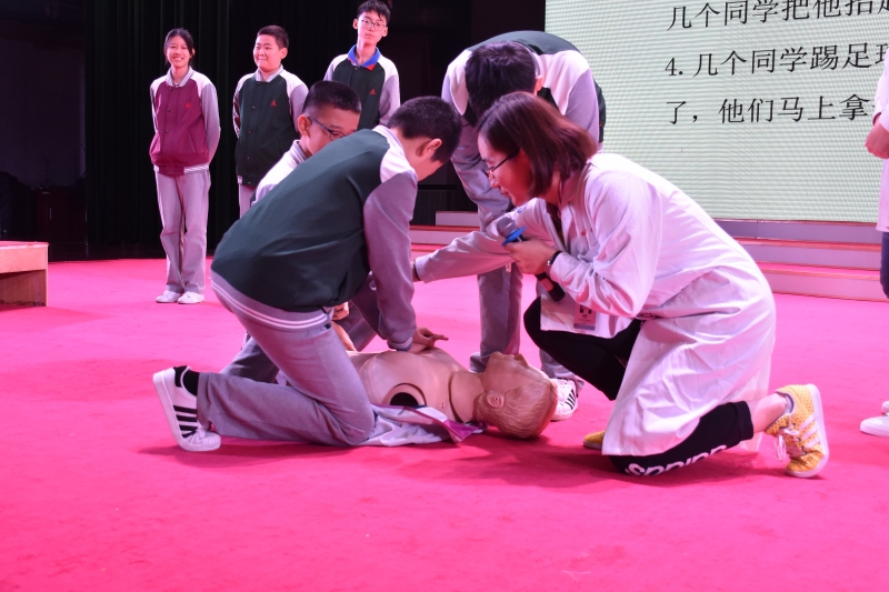 戴雯现场讲授如何正确拨打120、心肺复苏术、海姆立克急救法、溺水、触电、烧烫伤等相关抢救知识,党员志愿者利用模拟人示范,分组指导训练巩固等教学环节,使学生们初步掌握急救、自救的基本技能知识和初级救助实践操作,提高面对意外事故的应急能力。