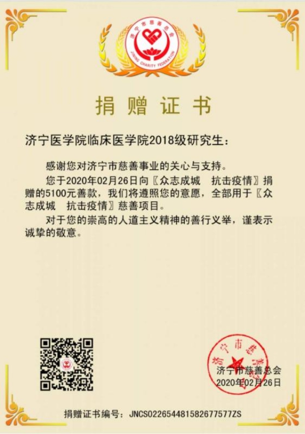 隔山隔水不隔爱,封城封路不封心。在疫情防控关键期,2018级临床医学院研究生自发举行募捐,奉献爱心,短短一日内筹得善款5100元。他们虽不能战斗在抗疫一线,可他们用另一种方式践行了庄严而神圣的医学生誓言。涓涓细流,汇聚成海;爱心点点,温暖人间。疫情无情人有情,众志成城渡难关。我们坚信,只要我们同舟共济、众志成城,一定能打赢这场新型冠状病毒肺炎疫情的阻击战!