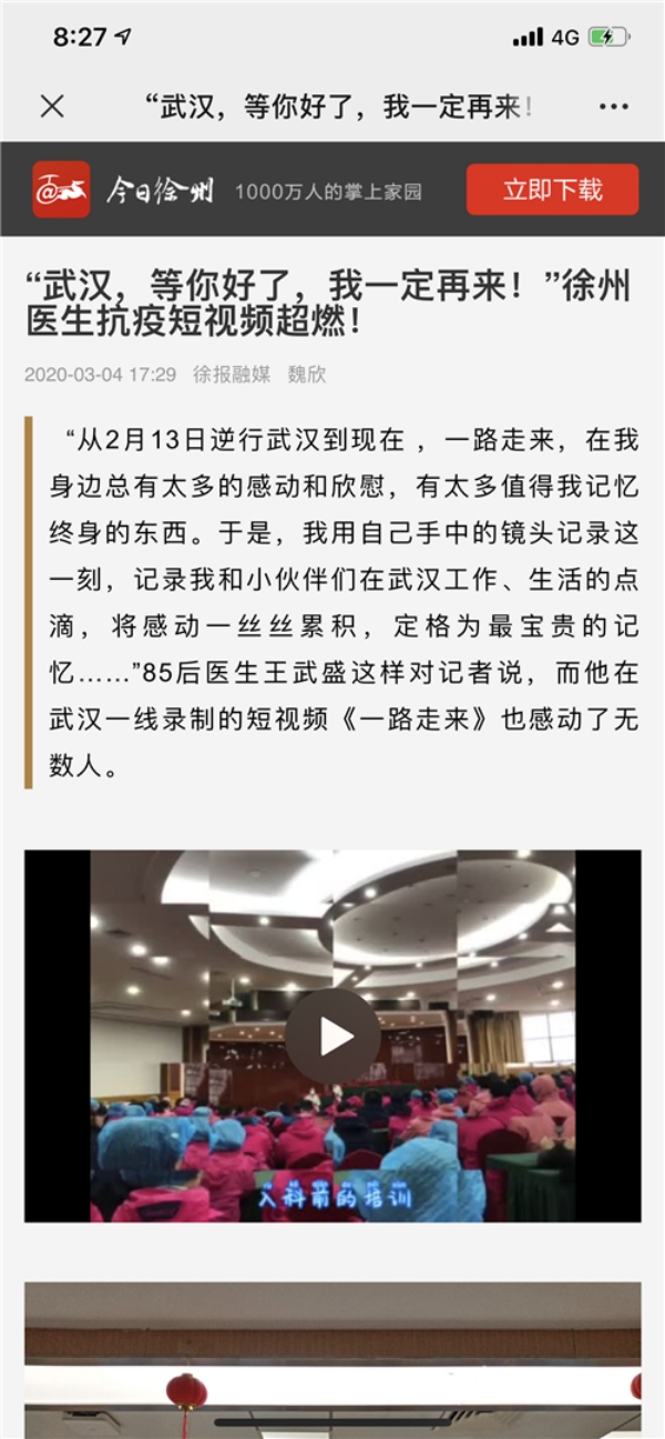 王武盛,2006级校友,徐州市中心医院重症医学科主治医师,作为徐州市第五批援鄂医疗队队员顺利完成在武汉市第一医院重症病区的支援任务,其优秀事迹被徐州日报刊登。