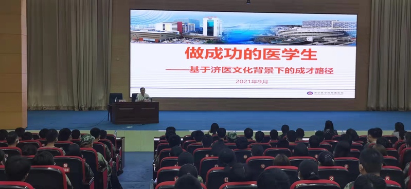王传军以《做成功的医学生——基于济医文化背景下的成才路径》为题,为来自五湖四海的新生介绍了学校的基本情况、核心文化理念、师资力量、教学条件、专业发展现状等,通过讲述济医附院抗疫事迹、小李红珊等多个“爱”的故事,诠释了“大爱济医”的深刻内涵。鼓励大家永葆医者情怀,不辱初心使命,为人类生命健康做出应有的贡献。