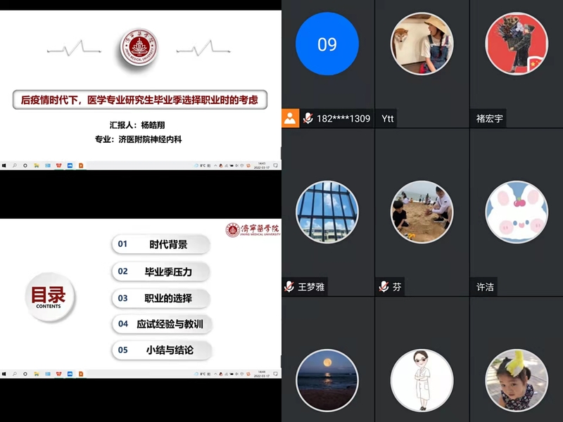 317日,临床医学院邀请2018级研究生校友、附属医院杨皓翔医师为2022届毕业研究生进行就业指导讲座。活动通过腾讯会议平台在线举行。