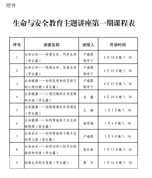 附件:生命与安全教育主题讲座第一期课程表