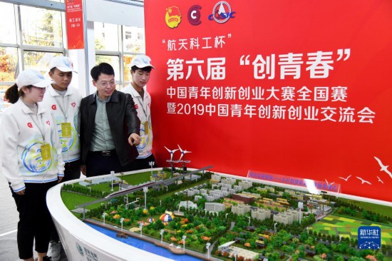 2019年11月1日,在山东青岛举行的第六届“创青春”中国青年创新创业大赛全国赛暨2019中国青年创新创业交流会上,参会人员在给志愿者介绍新乡村智慧能源服务模式。新华社记者 李紫恒 摄