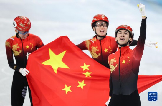 2月5日,中国队选手武大靖(右一)在比赛后庆祝。在首都体育馆举行的北京2022年冬奥会短道速滑项目混合团体接力决赛中,中国队夺得冠军。新华社记者 杨磊 摄