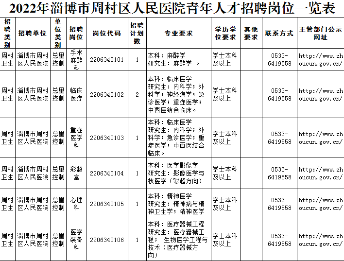 本次招聘主要为周村区人民医院引进和储备青年人才,我市各级机关、事业单位在编在岗人员及在招录(聘)工作中已被确定为考察人选的不得应聘。