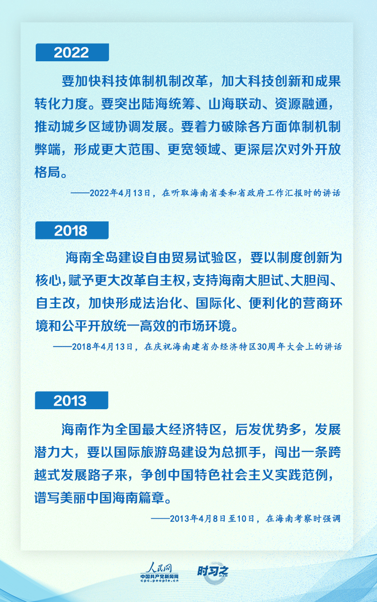 2022年,当习近平总书记再一次来到海南,蓝图一个个落地,时光里的发展变化令人感叹。习近平总书记观感深刻:“海南自由贸易港建设进展明显,整体推进蹄疾步稳、有力有序。”