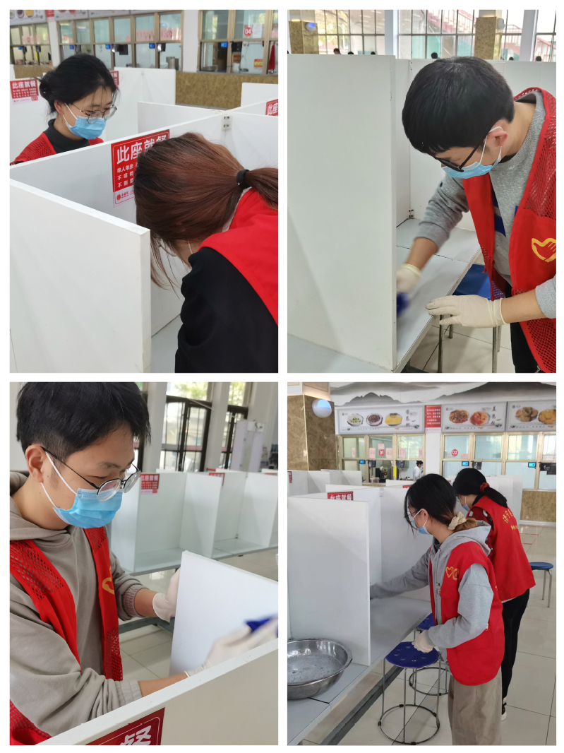 活动期间,志愿者们齐心协力、分工合作,擦除桌面油污,清理厨余垃圾、整理壁橱、清理垃圾污迹、清扫楼梯,不放过任何一个卫生死角,默默奉献,不怕辛劳,用实际行动改善餐厅就餐环境;同时号召同学们一起参与文明就餐,养成良好卫生习惯,他们的身影为校园增添了一抹“志愿红”,受到了广大师生的一致好评。