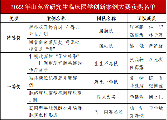 近日,由山东省教育厅指导的2022年山东省研究生临床医学创新案例大赛决赛落下帷幕。经过激烈角逐,临床医学院研究生获得一等奖1项,三等奖2项。