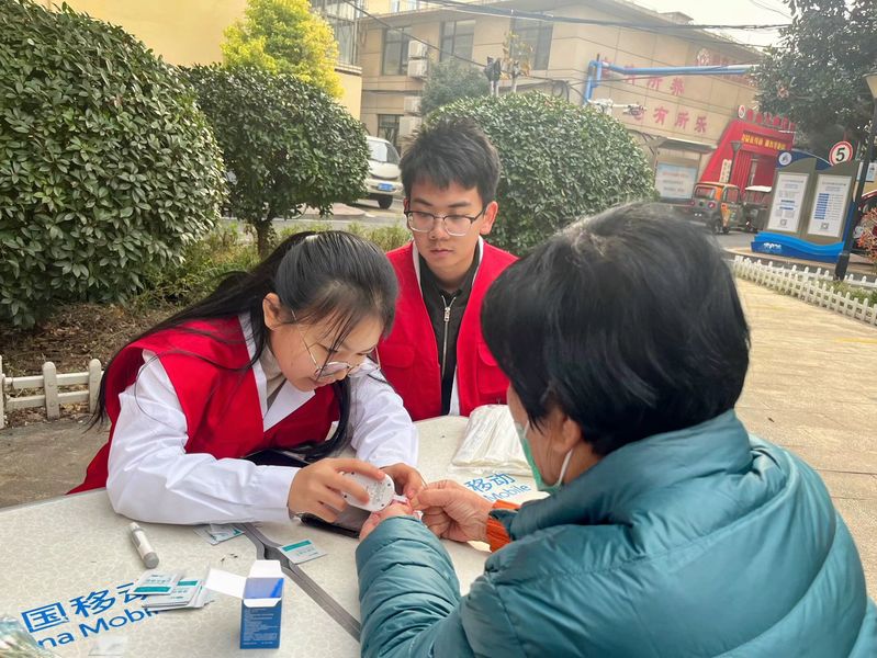 慢病早科普,关爱在行动。志愿者前往仙营社区开展慢性病防治宣讲活动。活动分两组进行,一组负责社区居民血压、血糖、血氧饱和度的测量,以及幽门螺旋杆菌的检测。另一组通过走访调研方式,了解社区居民的健康状况和饮食习惯,并针对慢性病日常防治等知识对其进行科普引导,倡导健康饮食,注重健康生活。