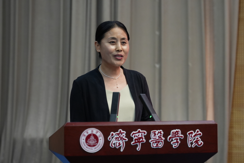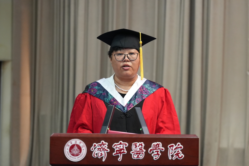教师代表冯其贞为毕业生送上祝福,勉励毕业生要志存高远,怀揣家国情怀,博学而成医,厚德而为医,谨慎而行医。廉洁修身,滋养浩然正气,努力做人民健康的忠诚卫士。