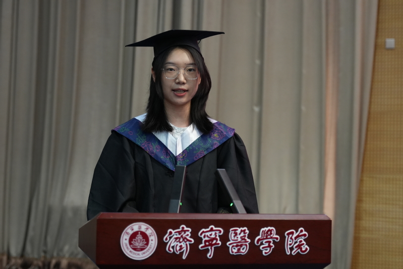 毕业生代表丁奕文表达了对母校、恩师、同窗的感恩和不舍,表示将继续践行济医临床人的使命担当,铭记“明德、仁爱、博学、至善”校训,奋楫笃行、踔厉奋发,传承好济医人的使命与担当,勇立潮头、行稳致远。祝福母校滋兰树慧,永续华章。
