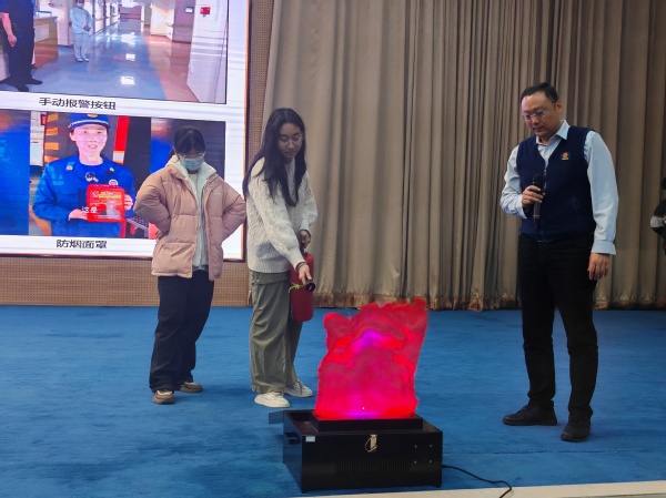 讲座尾声,闫虎鹏老师还精心安排了一场校园突发火灾应急模拟演练,邀请部分同学亲身参与,通过实践操作,让同学们更加直观地体验和学习标准化的消防自救流程,进一步巩固了讲座所学的理论知识。