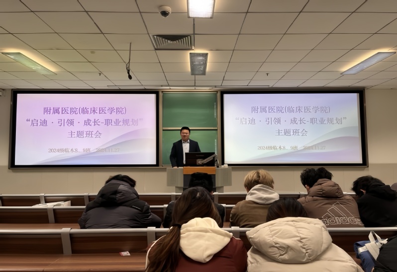 为进一步夯实优良学风建设,助力学子成长成才。2025年11月27日上午,附属医院(临床医学院)党委委员、副院长孙占国及帮包班级职能部门深入2024级临床医学本科8班、9班,主持召开了以“启迪·引领·成长﹣职业规划”主题班会。