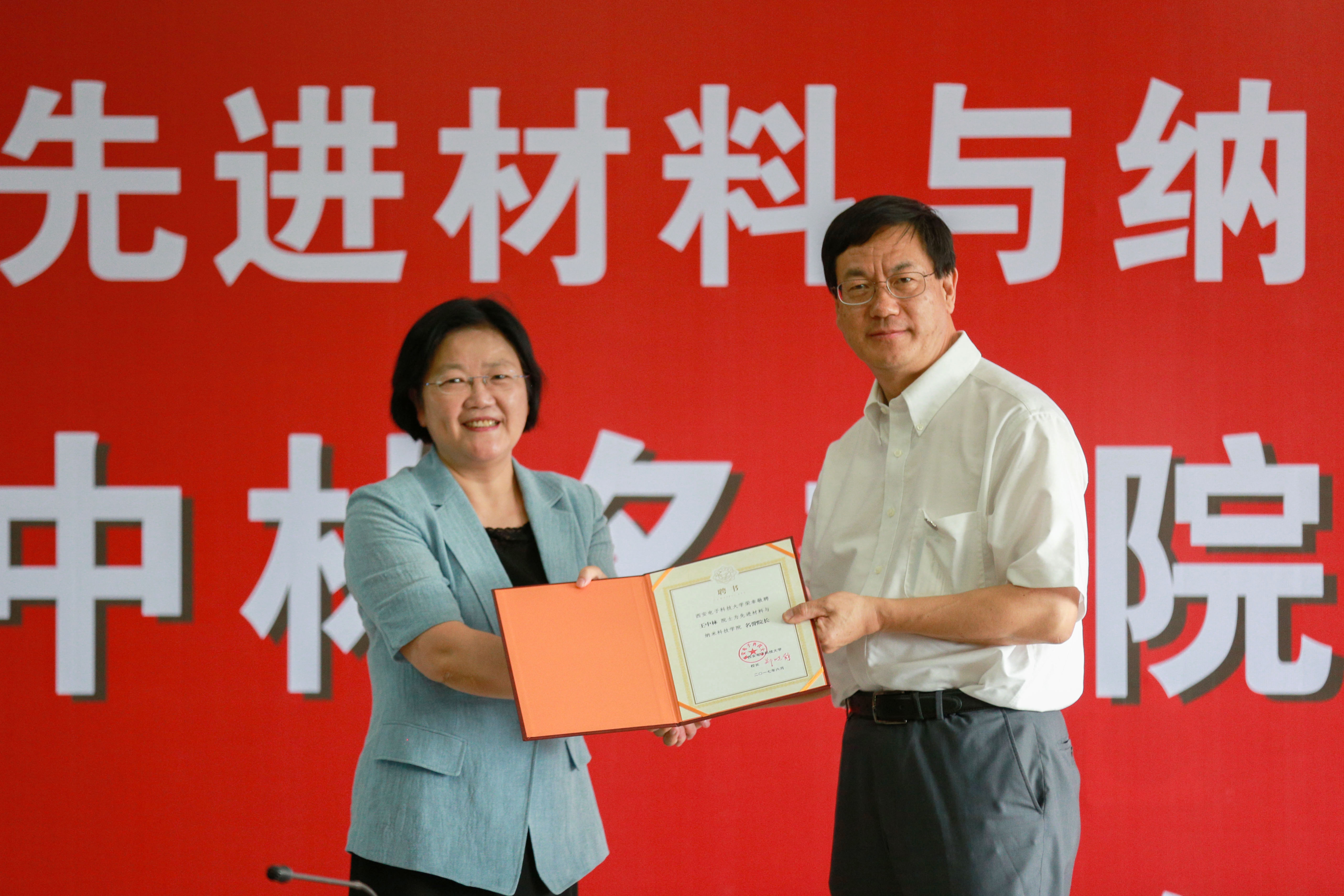 郝跃对王中林进行了简要介绍,并宣读了聘任其为西安电子科技大学先进材料与纳米科技学院名誉院长、首席科学家、学术委员会主任的聘任文件。郑晓静为王中林佩戴校徽并颁发聘书。
