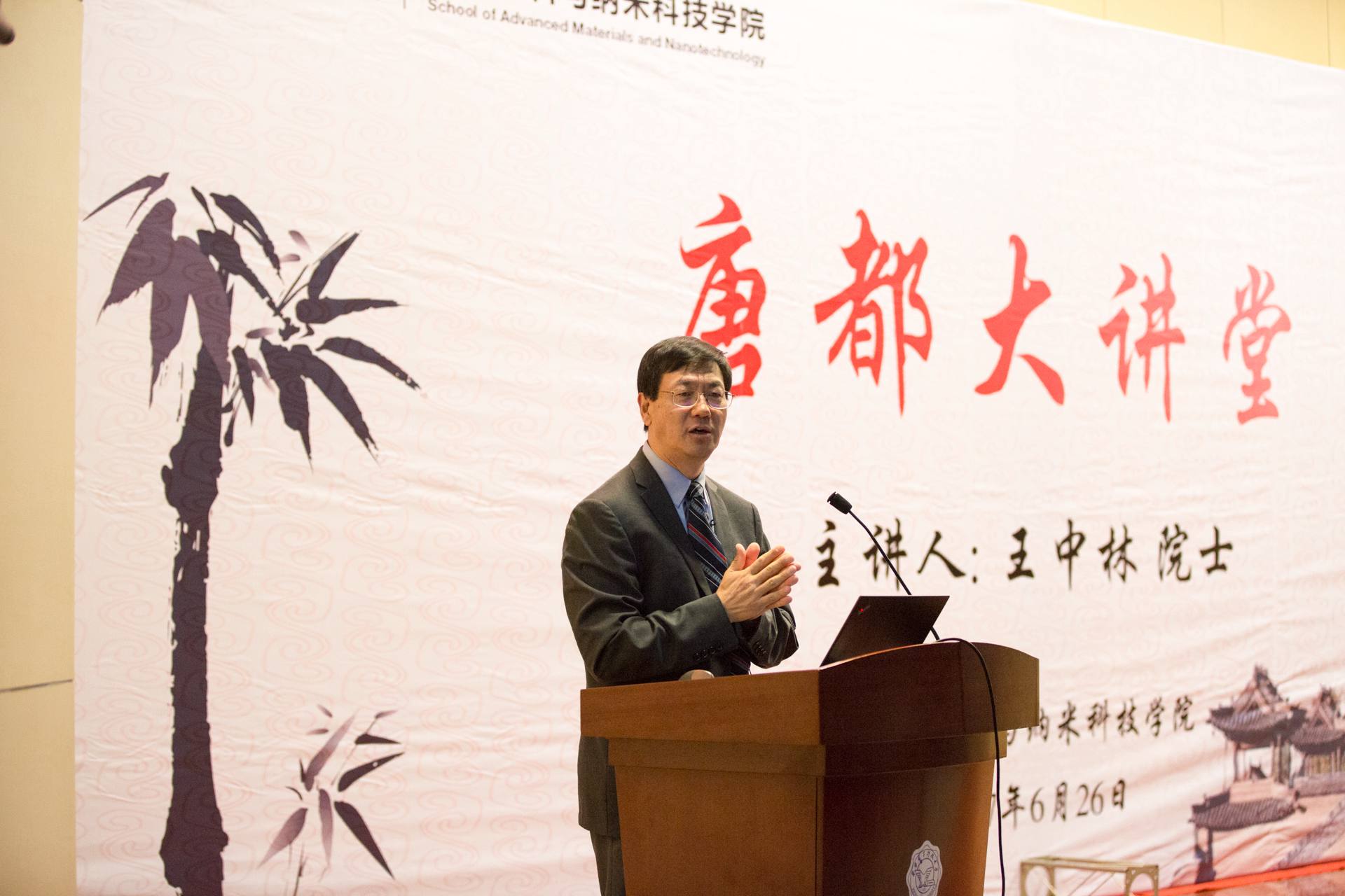 6月26日上午,西电“唐都大讲堂”开启仪式在南校区210报告厅举行。王中林以“从麦克斯韦位移电流到基于纳米发电机的自驱动系统和蓝色能源”为题,为在场300余名西电师生带来一场科学的饕餮盛宴。党委书记、校长郑晓静院士出席了报告会并为王中林颁发“唐都大讲堂”纪念杯。报告会由党委副书记龙建成主持。