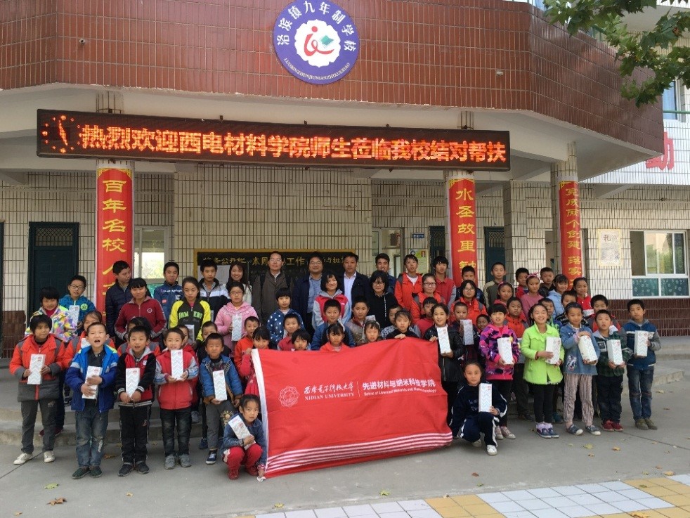 为贯彻落实党的十九大和十九届二中、三中全会精神,以习近平新时代中国特色社会主义思想以及扶贫开发重要战略思想为指导,深入推进“一院一校一品”帮扶行动,根据先进材料与纳米科技学院党委《开展定点结对扶贫的实施方案》的安排,10月19日,学院党委书记卢硕带领材料学院师生代表前往蒲城县洛滨镇九年一贯制学校开展结对帮扶工作。