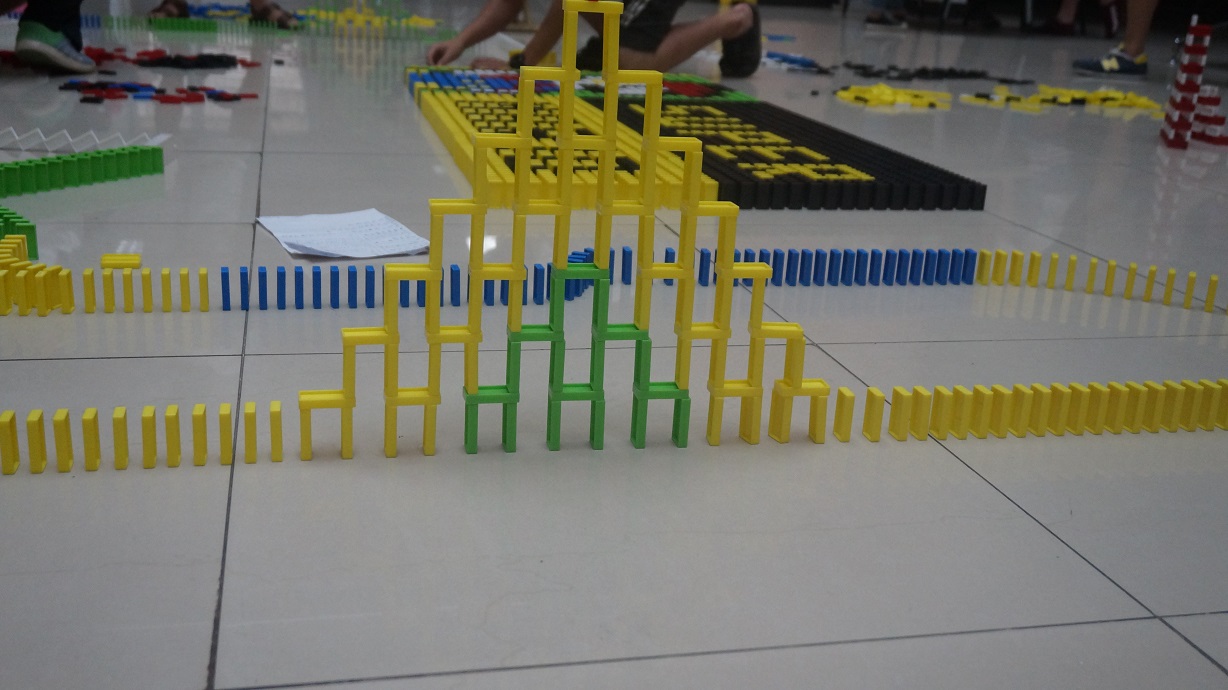 多米诺,比的不只是排列的精妙,更重要的是耐心,是一直坚持的毅力。从一点半到六点半,这漫长的五个小时,他们用自己的膝盖,擦亮了一方地板;他们用自己的双手,彰显出了这个团队的凝聚力。没有注定的天时,地利,人和,只有失败了仍不放弃,坚持才是最后的胜利;没有预料的一帆风顺,走走停停但只要永不止步,就会到达终点。也许只是一着不慎,就会推倒一大片;也许只是一步不意,就可能推倒了别人的。多米诺,教会我们的是,做事,要步步为营。