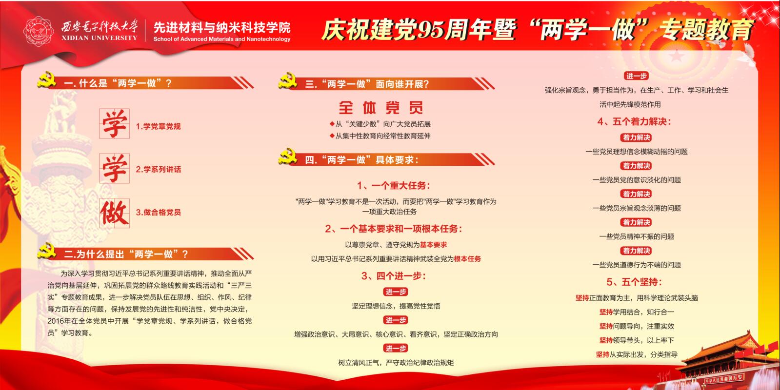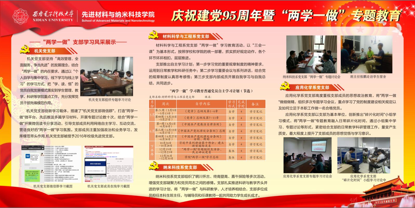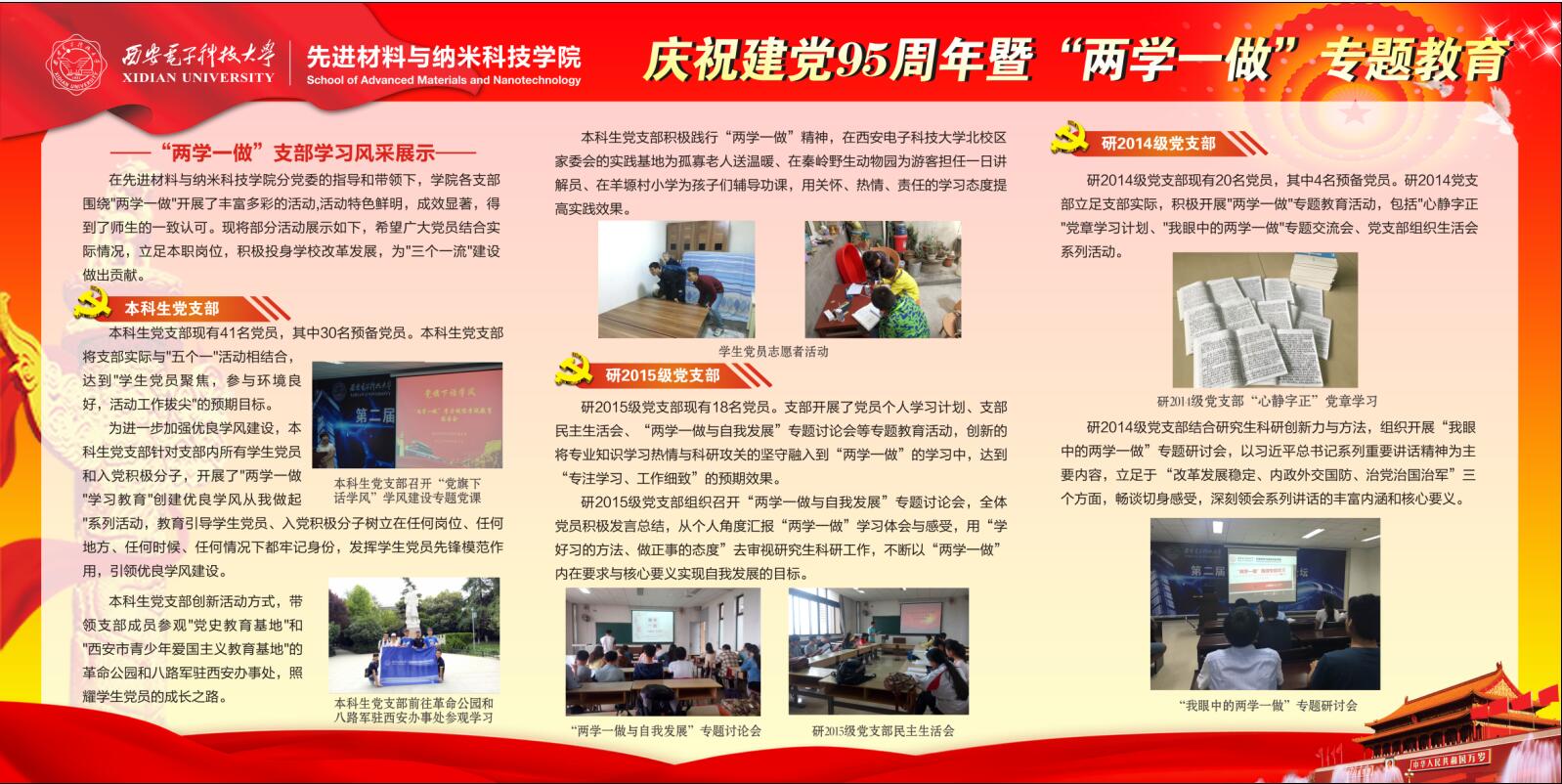 (通讯员 钟决坤 卢琳)为落实“两学一做”学习教育精神,充分发挥党员先锋模范作用,浓郁学院学习氛围,2016年9月,先进材料与纳米科技学院在G楼一层大厅学院文化展示区推出庆祝建党95周年暨“两学一做”教育专题展示。 先进材料与纳米科技学院积极开展“学党章党规、学系列讲话,做合格党员”学习教育活动,在学院分党委的指导和带领下,各支部以“两学一做”为中心开展了丰富多彩的学习教育活动,特色鲜明,成效显著。本次展示主要以展板的形式体现,紧紧围绕“两学一做”的核心教育内容、学院学习教育方案、各支部创意活动等内容,采用文字、图片和图表相结合的方式,全面、凝练且清晰的展示了“如何学、怎么做”,学院特色教育活动以及各支部将“两学一做”融入学习、教学、科研、管理等方面的风采。希望广大党员结合实际情况,立足本职岗位,积极投身学校改革发展,为“三个一流”建设做出贡献。(完)