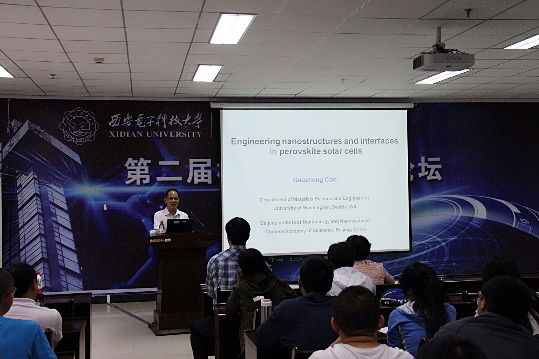 (通讯员 闫养希 卢琳)5月12日下午,西电“华山学者”讲座教授曹国忠为材料院师生作了题为“Engineering Nanostructures and Interfaces in Perovskite Solar Cells”的学术报告。报告会在南校区G楼118学术报告厅进行,共50余名学院师生聆听了报告,报告会由院长助理李智敏主持。
