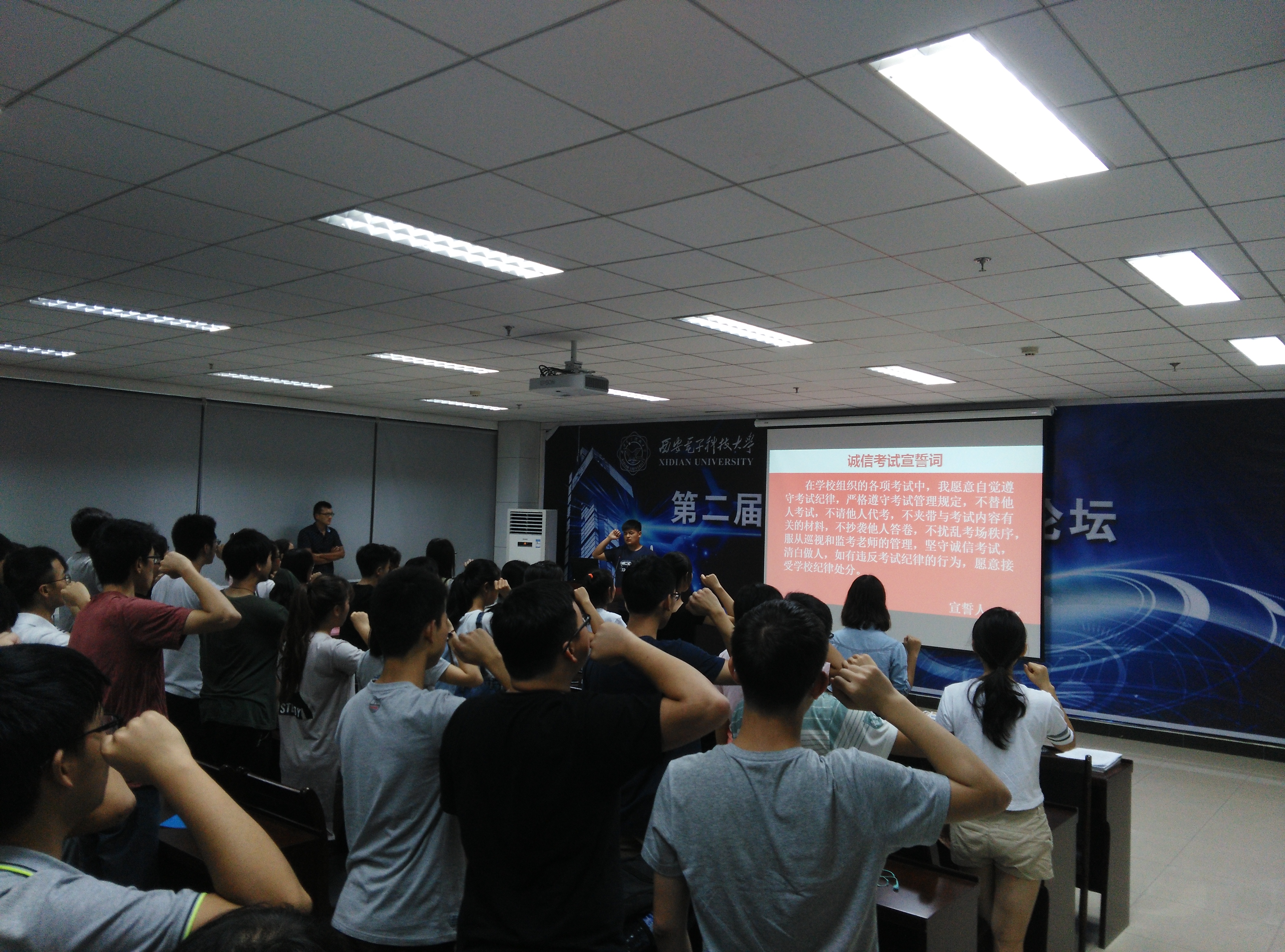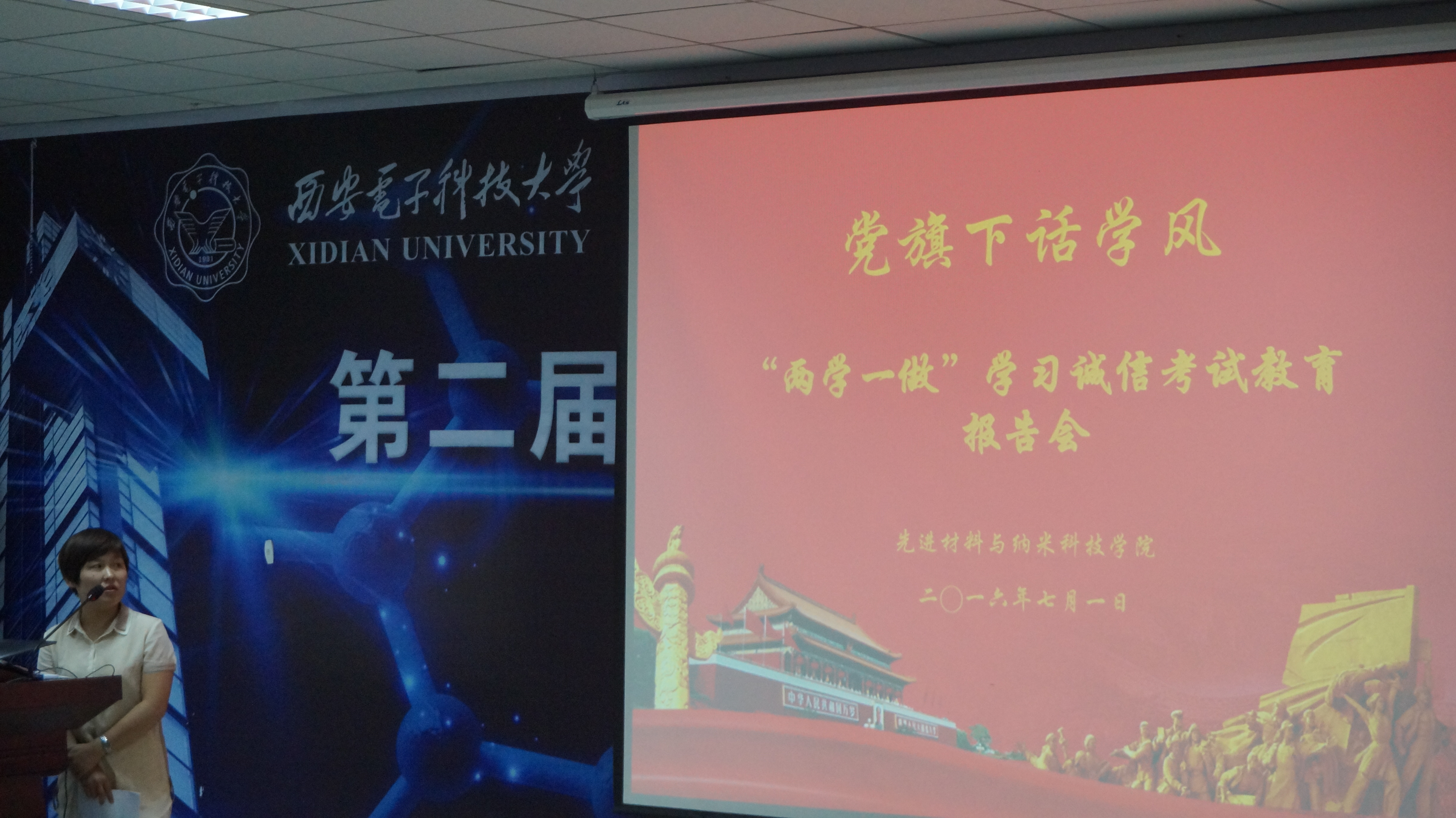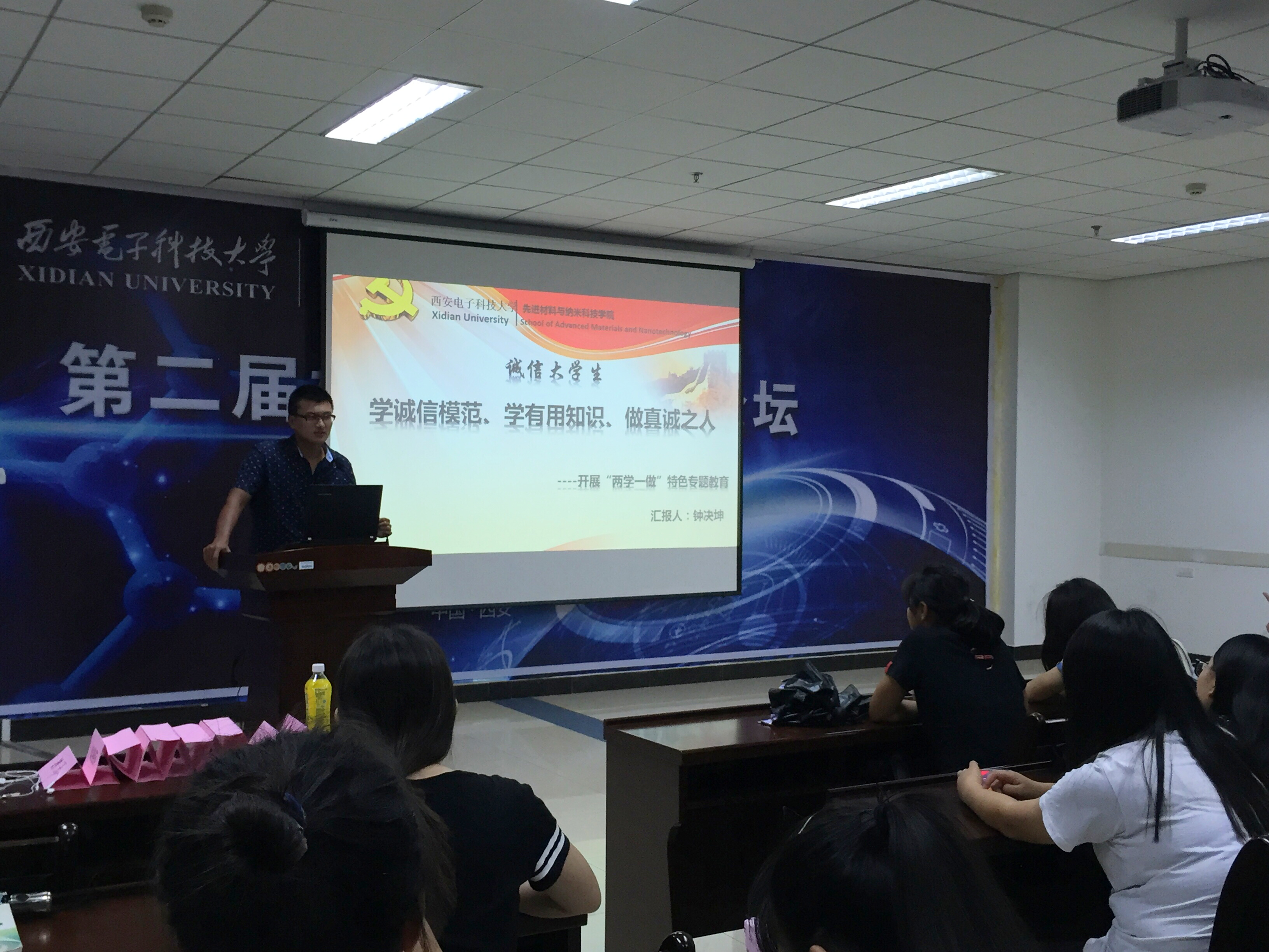 此外,为了增强同学们诚信意识,7月3日晚18:30,先进材料与纳米科技学院2015级辅导员钟决坤在G-118报告厅,举办了“诚信大学生,诚信考试”专题教育活动,全体大一学生参会。活动中,辅导员钟决坤紧扣主题,从“行”、“考”、“职“、“课”四个方面着重解释此次专题“诚信教育”,并融入当代热点事例分别对这四方面内容加以分析,激励每位同学“学诚信模范,学有用知识,做真诚之人”。最后在钟决坤的带领下,全体大一学生郑重宣誓,争做诚信大学生,争创学院优良学风。