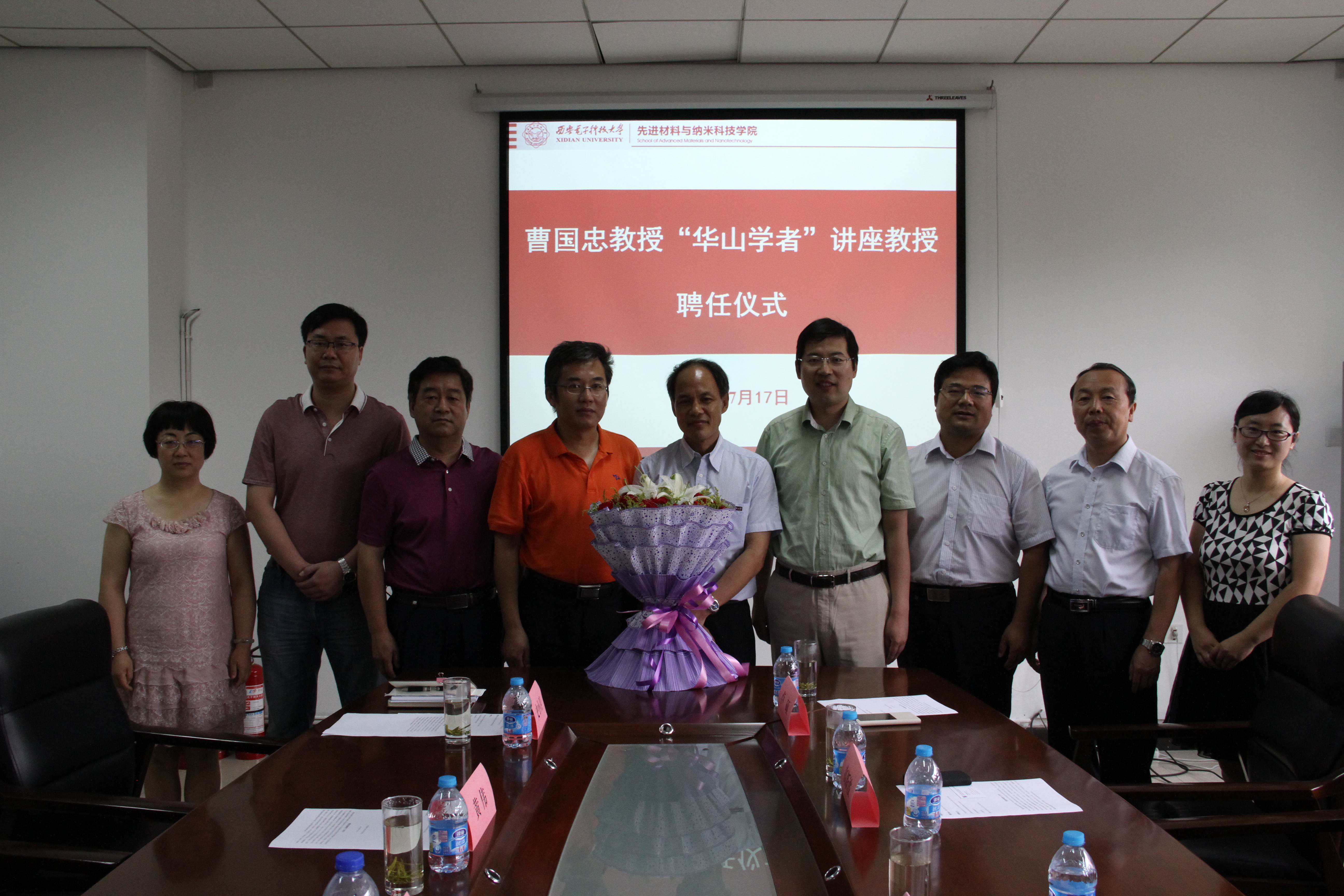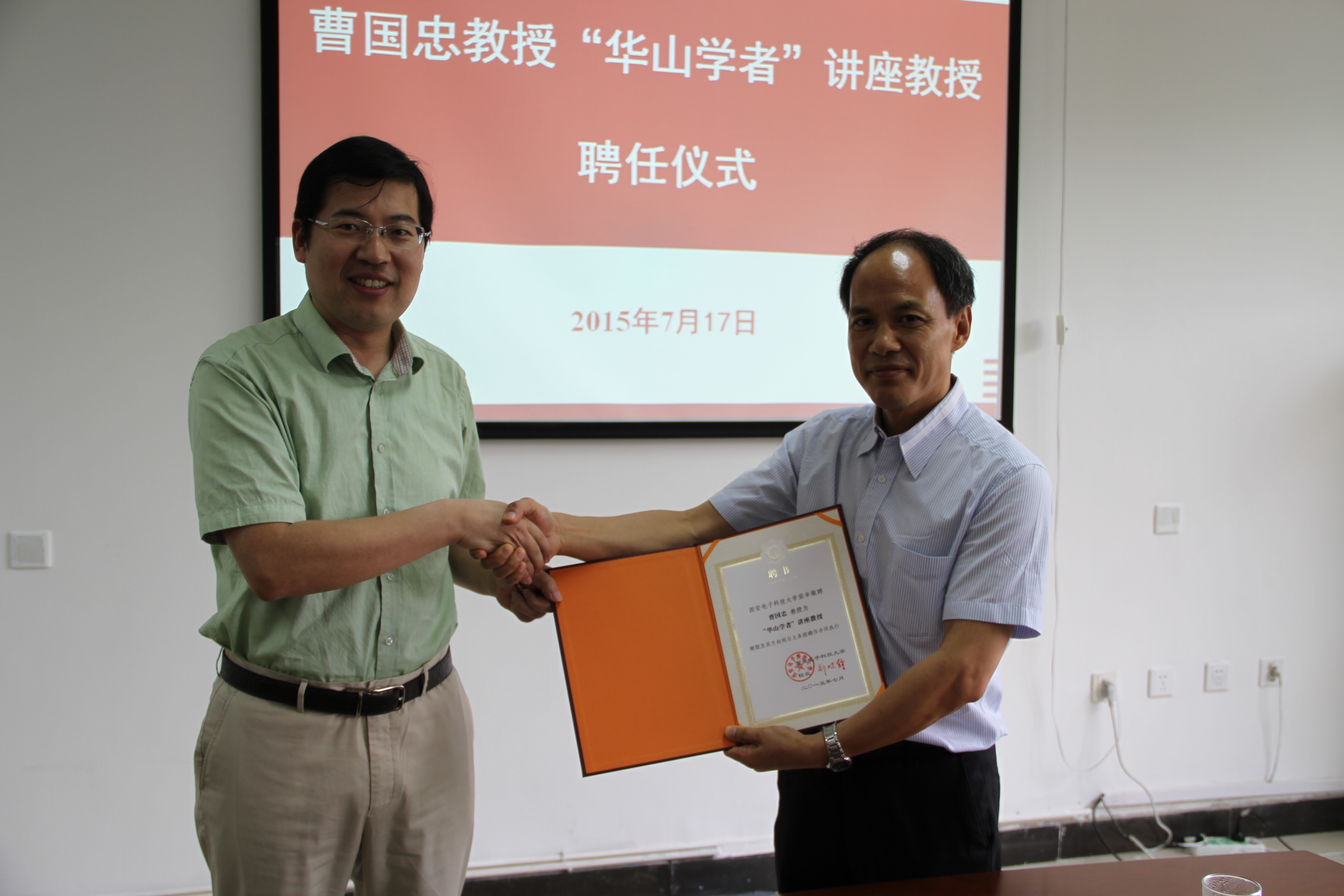 (通讯员 卢琳)7月17日,西电“华山学者”讲座教授曹国忠的聘任仪式在南校区G楼先进材料与纳米科技学院会议室进行,曹国忠正式受聘担任学校“华山学者”讲座教授。校长助理高新波出席聘任仪式并为曹国忠颁发聘任证书。