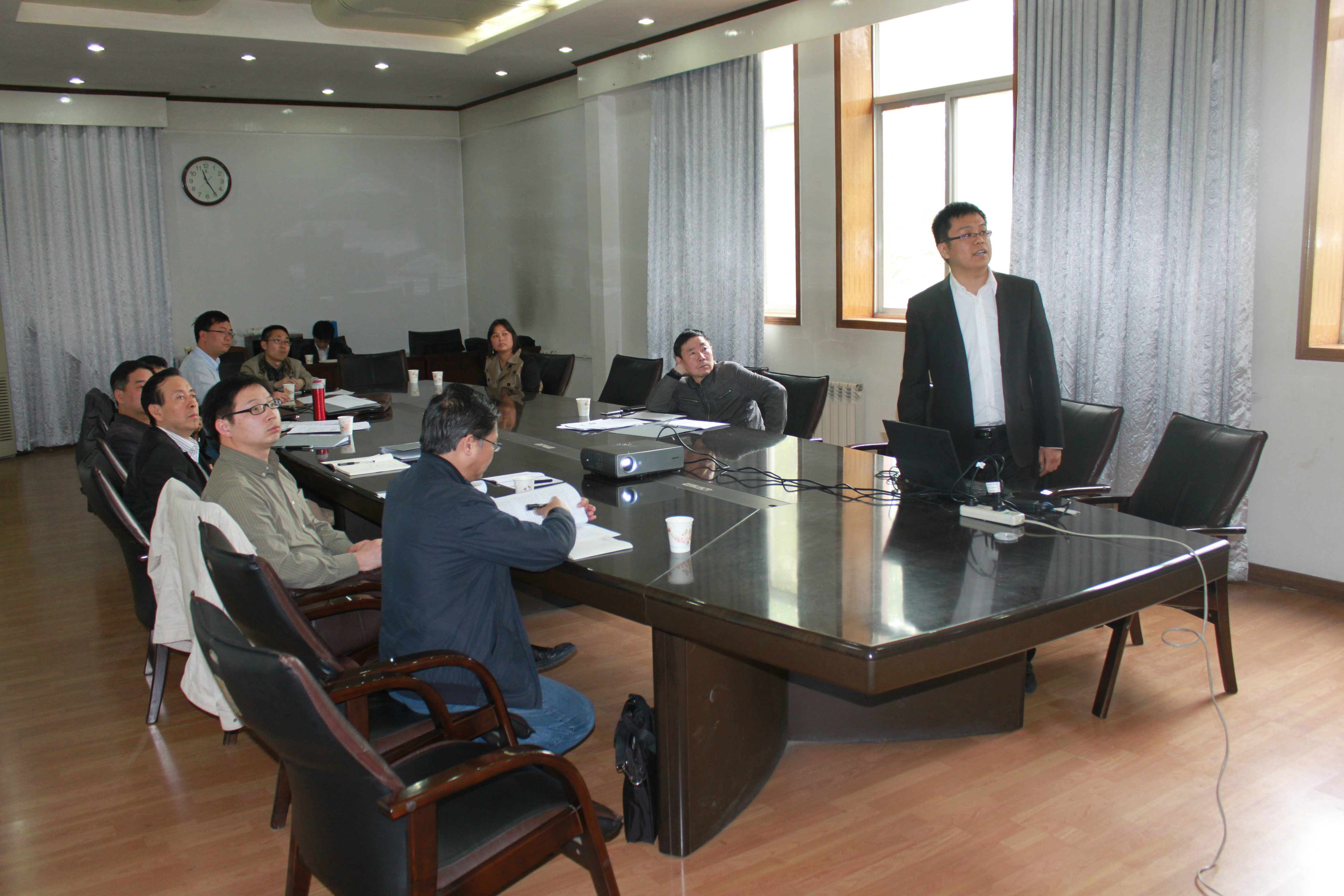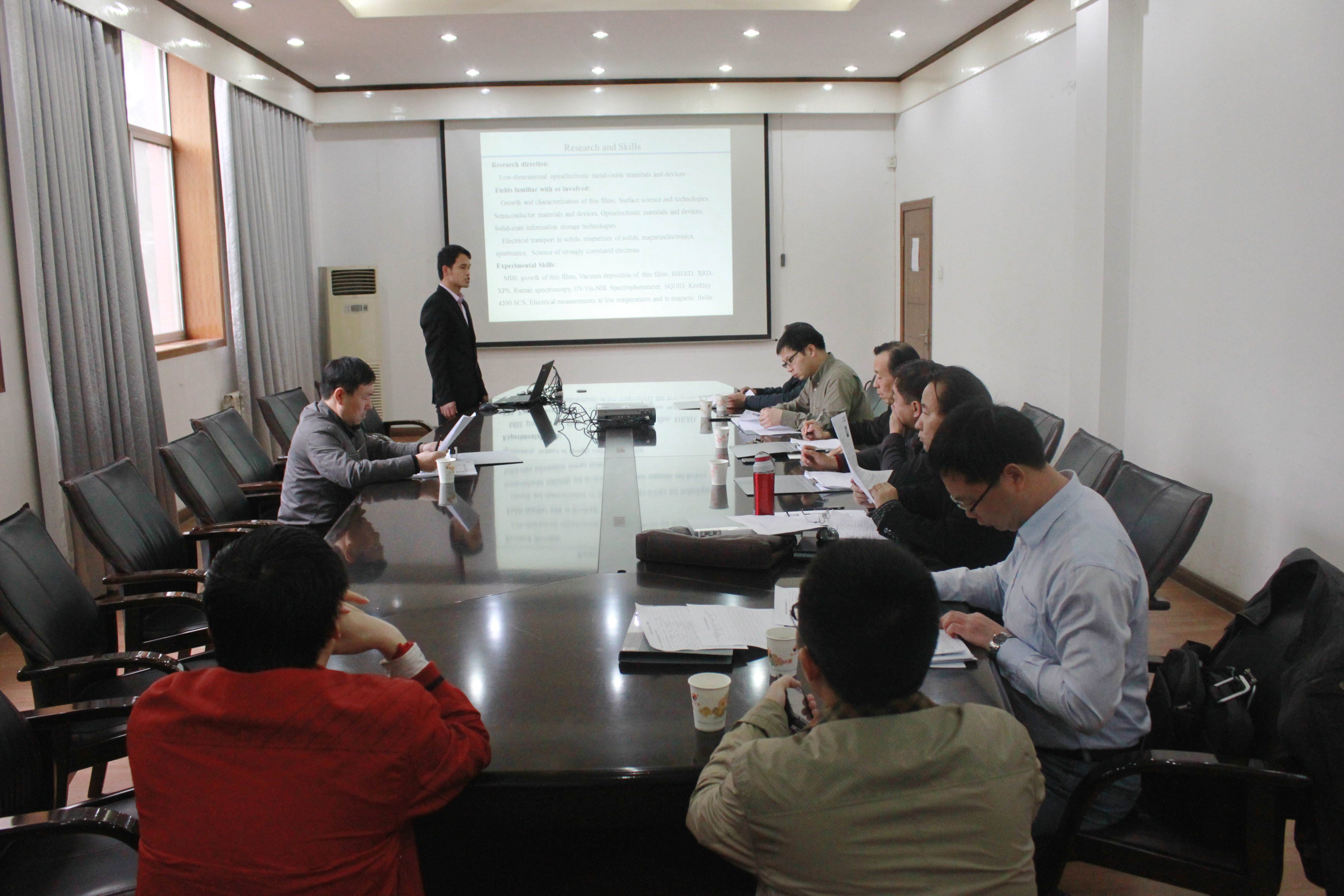 本次面试有来自全国各高校的9位博士参加,首先,每位博士都以PPT的形式将自己的个人简介、以往的科研工作以及对未来的设想作了较为详细的介绍,并针对具体问题与各位评委老师进行了交流与探讨。面试过程中,郝跃与各位教授针对学院未来的发展方向以及人才引进深入交换了意见。
