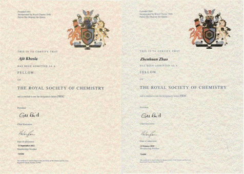 近日,西安电子科技大学先进材料与纳米科技学院Ajit Khosla和赵振环当选英国皇家化学会会士(Fellow of the Royal Society of Chemistry, FRSC)。