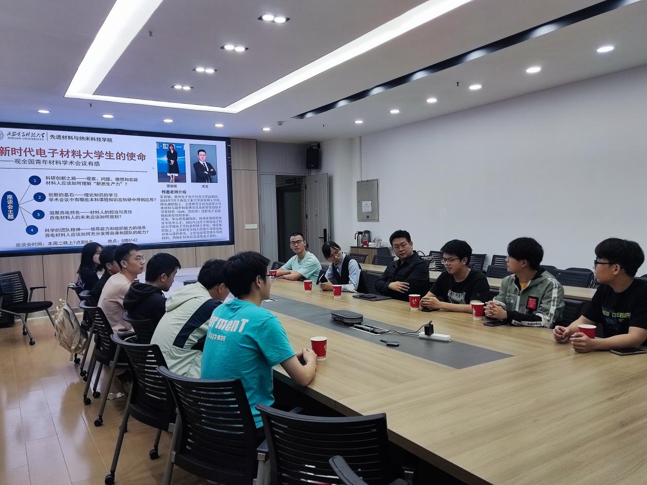 4月23日19点到20点,“新时代电子材料大学生的使命——观全国青年材料研讨会议有感”本科生座谈会在G楼G142会议室召开,材料学院雷毅敏和周龙两位老师受邀与大一至大三的本科生代表共聚一堂,深入探讨了如何在新时代背景下如何肩负起材料领域的使命与担当。