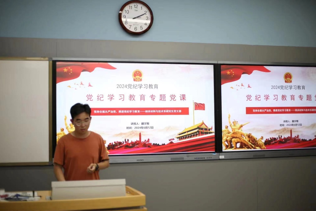(通讯员 宫明威)为落实全面从严治党要求,推进党纪学习教育深入开展,确保党员更好贯彻执行党的纪律和规矩, 6月12日下午,先进材料与纳米科技学院纳米材料与技术系研究生党支部在C楼126召开会议,支部书记魏宇翔以“坚持全面从严治党 推进党纪学习教育”为主题讲授专题党课