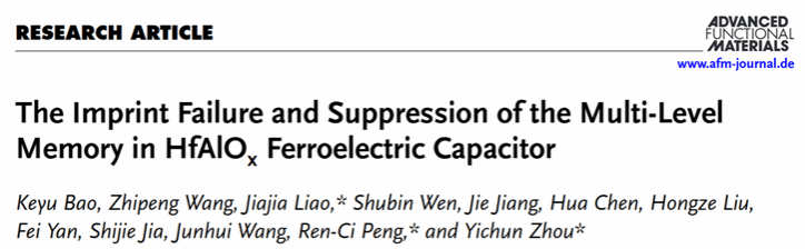 近日,西安电子科技大学先进材料与纳米科技学院周益春教授团队在这一研究领域取得重要进展。研究团队在多值HfAlOx铁电电容中发现尽管饱和极化状态受到印记影响后仍能被准确写入,但所有中间极化状态的写入却完全发生错误。针对这一发现,团队重点分析了印记效应产生前后铁电电容内建电场和带电缺陷(主要是带电氧空位)的变化及其关联,提出了多值存储极化状态影响带电氧空位分布并形成非均匀内建电场、进而导致中间极化状态无法被准确写入的失效模型。该模型通过相场模拟得到了进一步验证。在此基础上,团队设计了一种预编程方法,通过使铁电薄膜的内氧空位重新分布来抵消印记效应的影响。实验证明该策略能在室温环境下实现长期稳定的准确编程,为发展可靠的多值HfO2基铁电存储器提供了新的途径。该研究成果以“The Imprint Failure and Suppression of the Multi-Level Memory in HfAlOxFerroelectric Capacitor”为题发表在材料领域著名学术期刊Advanced Functional Materials上(2024年影响因子为18.5)。论文的第一单位为西安电子科技大学,材料院博士生包克瑜为论文第一作者,