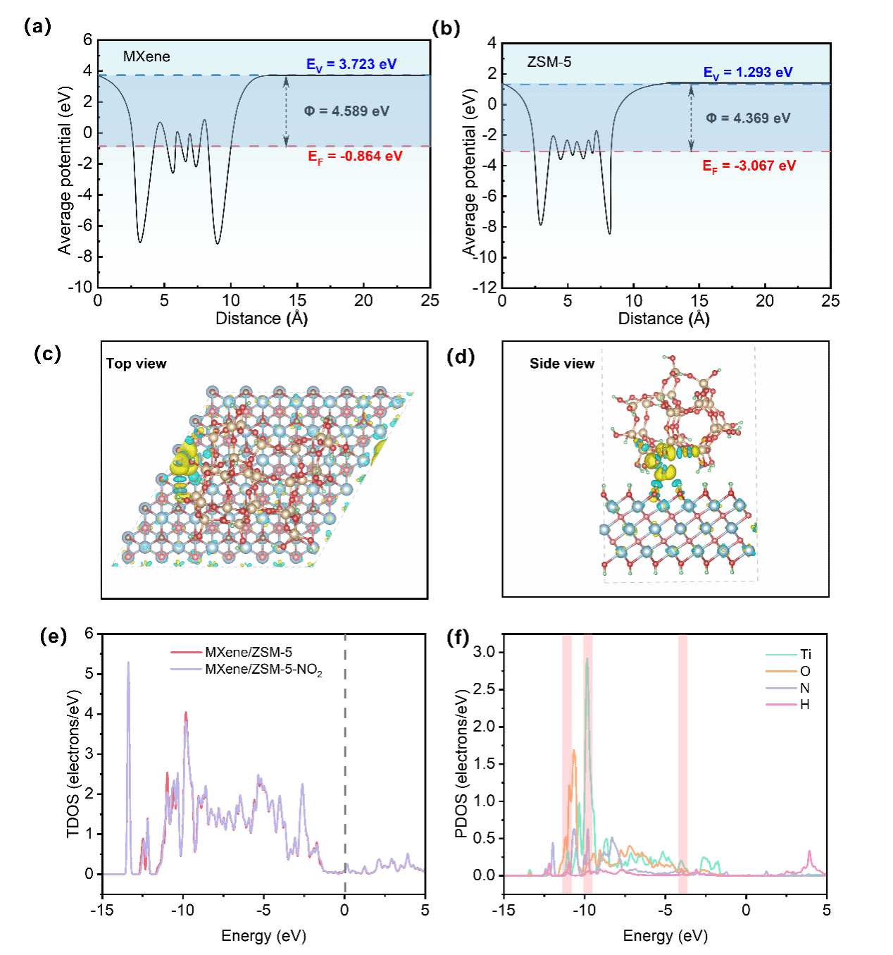 3. (a-b) MXeneZSM-5的表面平均静电势与功函数;(c-d) MXene/ZSM-5-NO2吸附模型的差分电荷密度图;(e) 吸附NO2前后体系的总态密度(TDOS曲线;(f) 吸附模型的投影态密度(PDOS)曲线。