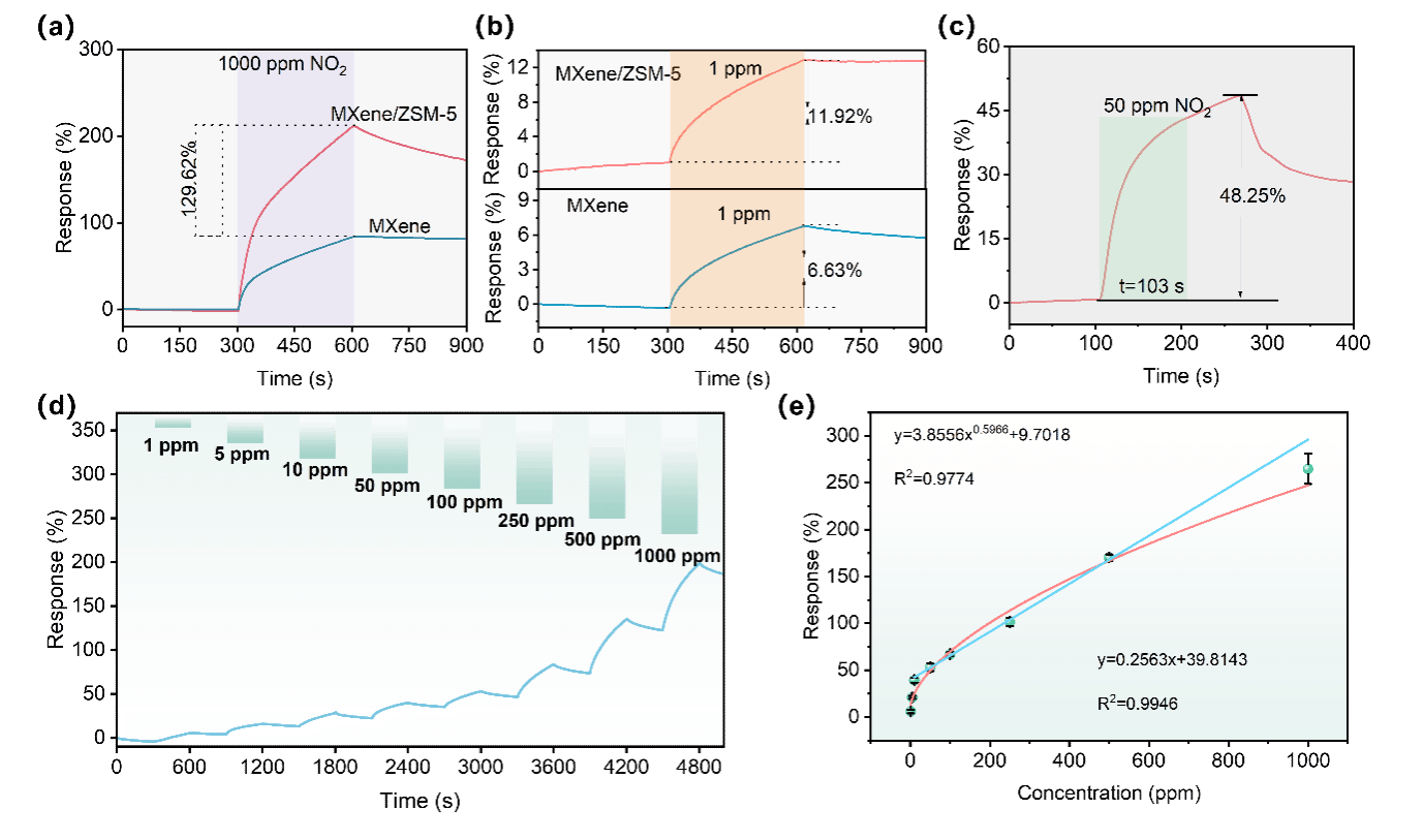 1. (a) MXene/ZSM-5与纯MXene1000 ppm NO2的响应对比;(b) 1 ppm NO2的响应对比;(c) 50 ppm NO2的实时响应-恢复曲线;(d) 不同浓度NO2下的响应值及拟合曲线。