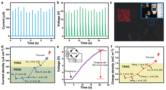 a,b,整流后IENG的输出电流和电压信号。c,IENG在不经储能的情况下直接点亮100个红色LED。d,IENG的电流密度在现有工作中的位置。e,经过整流后,IENG对1 μF电容的充电曲线,每个周期对应的充电量为405 nC。f,IENG的表面电荷密度同已报道记录值的比较。