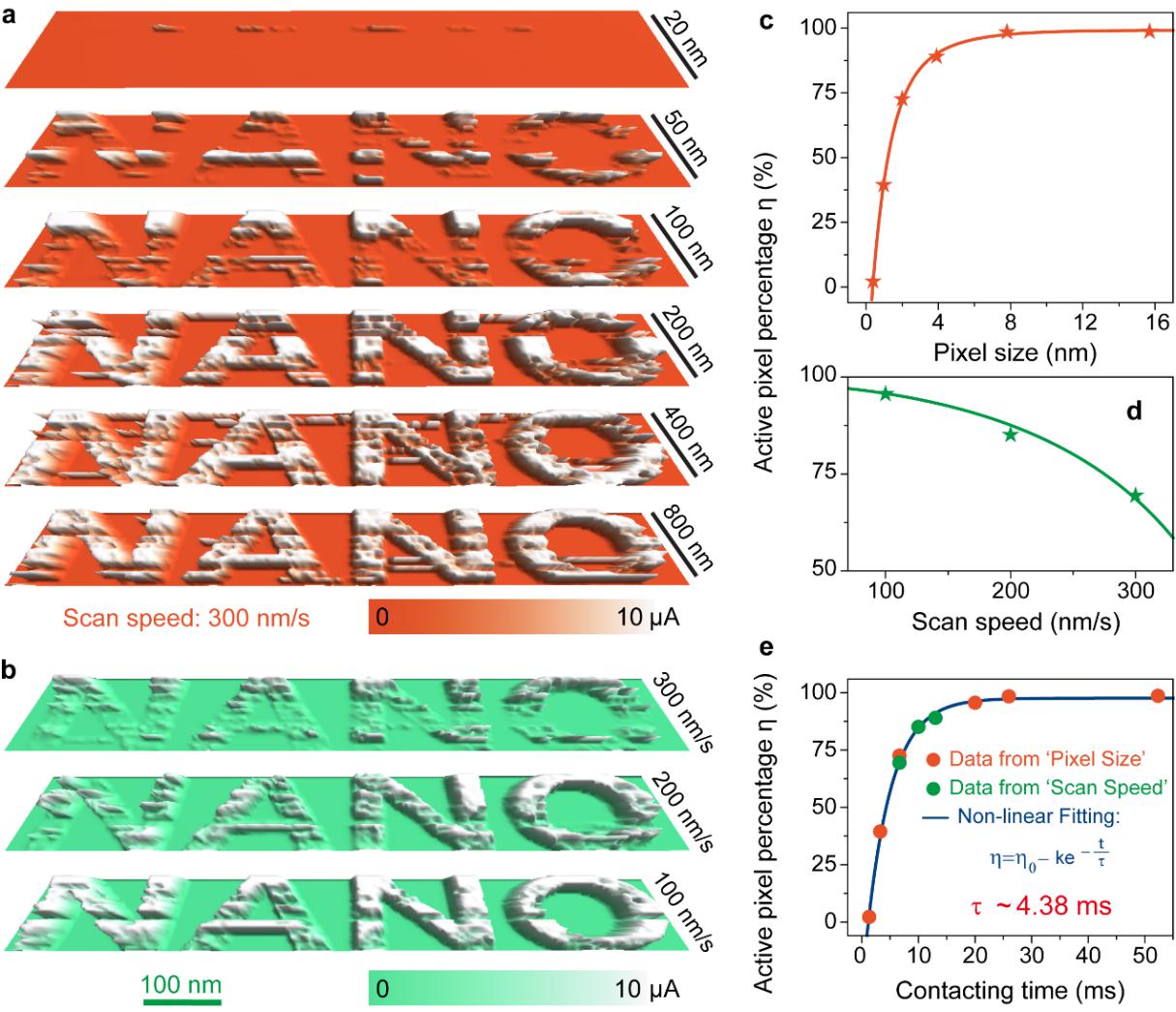 (a) 不同尺寸情况下的力成像测试;b) 不同扫描速度情况下的力成像测试;c-d) 压电电子学隧道结的动态响应时间分析)