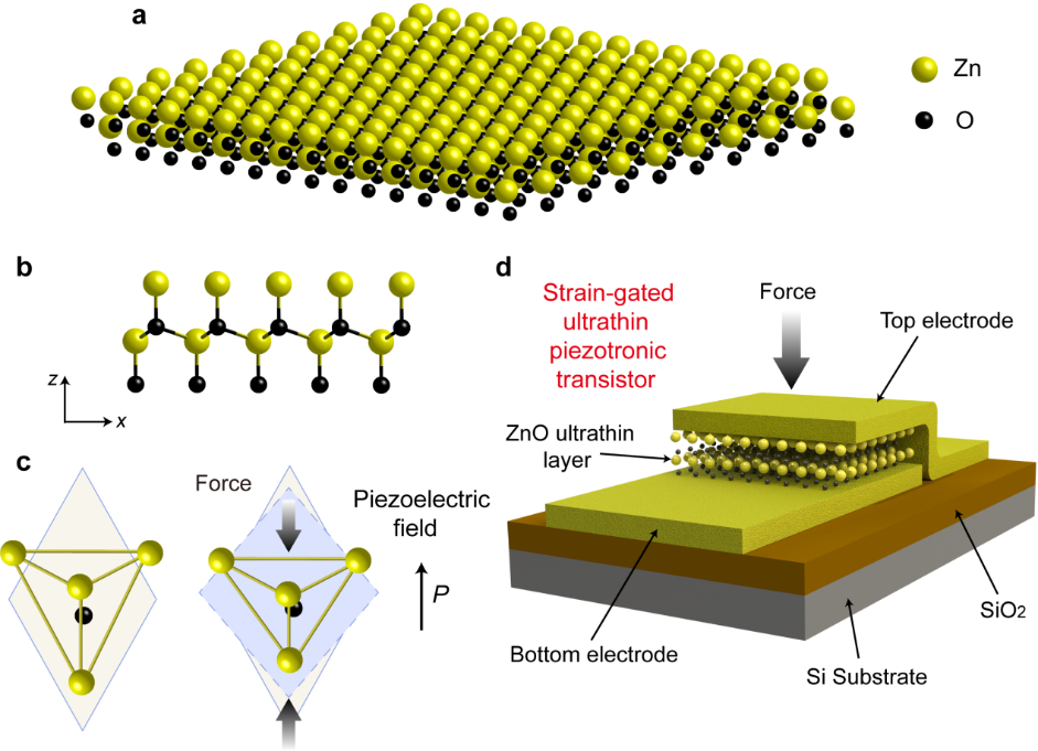 为了探索这种突破局限的可能性,在西电先进材料与纳米科技学院名誉院长、中国科学院北京纳米能源与系统研究所所长王中林院士与我校秦勇教授的共同指导下,王龙飞博士和博士生刘书海等研究成员通过深入研究二维超薄氧化锌面外压电特性,成功地制备出一种新型的、沟道只有~2 nm的超薄氧化锌压电电子学晶体管,并且,首次将压电电子学效应引入到二维超薄非层状压电半导体中。