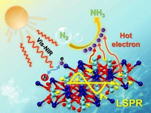 近年来,纳米光电化学与应用团队聚焦绿色化学和清洁能源技术,在光催化固氮合成氨领域取得了一系列的研究成果。团队创新性的提出了开发基于等离激元半导体光催化固氮技术。等离激元效应来自于自由载流子的集体振荡,广泛存在于金属纳米结构中。尽管金属等离激元纳米材料在光催化中也有广泛的应用,可以通过等离激元增强的光吸收和散射、热载流子传输以及等离激元共振能量传递等机理提高太阳能转化效率,但其能量转化效率仍然有限,多用于弥补半导体材料的弱点。研究发现一些半导体纳米材料在可见光和近红外光范围表现出优异的等离激元共振吸收。相比等离激元金属纳米材料,这些半导体的等离激元共振效应的调控手段更加丰富。等离激元半导体材料普遍具有较高的缺陷浓度、非常宽的光响应波段,因而是理想的固氮光催化剂。该团队的研究人员设计制备了新型的等离激元半导体材料SrMoO4,其在可见光和近红外光范围具有强的等离激元吸收,其共振吸收峰的中心位置可从520 nm调节到815 nm,具有等离激元效应的SrMoO4表现出优异的可见光固氮性能。其增强的光催化活性主要来源于更宽的太阳光吸收波段、等离激元激发产生的热载流子和丰富的缺陷活性位点。一方面,宽禁带的SrMoO4具有较高的导带能级,本征激发形成的导带电子能在热力学上将氮气分子还原为氨;另一方面,等离激元激发产生的热载流子具有较高的能量,能够越过固液界面的肖特基能垒,将吸附在催化剂表面缺陷处的氮气分子还原为氨。但是,尽管缺陷在光催化固氮中展现出多方面的优点,其在半导体中的浓度仍需进一步的优化。我们的研究结果表明,过多的氧空位将会促进载流子的复合,从而降低催化剂的固氮性能。该研究工作发表在我国催化领域的TOP期刊《催化学报》的英文版Chinese Journal of Catalysis上,其中博士生李强同学为论文第一作者,赵振环副教授、青年教师王政,以及电子科技大学王志明教授为论文的共同通讯作者,先进材料与纳米科技学院为论文第一单位。