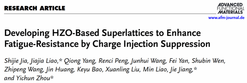 然而,在数据反复的写入和擦除过程中,HfO2基铁电存储器频繁出现的薄膜疲劳失效现象,已成为阻碍其大规模产业化应用的“拦路虎”。要攻克这一难题,实现高耐久性的铁电存储器,则必须深入探究铁电存储器件在信息擦写过程中铁电极化翻转的物理过程。其中,厘清极化翻转过程中漏电现象产生的物理机制,及其对击穿型疲劳失效造成的影响,显得尤为重要。如何建立微观极化翻转过程与宏观电学性能失效之间的关联,并大幅提升铁电薄膜材料的抗疲劳性能,是摆在科研人员面前的一项极具挑战性难题。近日,西安电子科技大学周益春教授团队在这一研究领域取得重要进展。研究团队借助层状异质结构的Hf0.5Zr0.5O2-ZrO2超晶格设计,对微观极化翻转过程中的电荷注入现象与宏观疲劳失效之间的关联机理进行了深入剖析与阐释。基于此,成功制备出高耐久性(>1012次电场循环)铁电薄膜材料,并同时具备低矫顽场 (2Ec≈1.7 MV/cm)和快速极化翻转速度。这一成果为解决HfO2基铁电存储器疲劳失效问题奠定了理论基础,也为相关领域研究提供了新的解决思路。该研究成果以“Developing HZO-Based Superlattices to Enhance Fatigue-Resistance by Charge Injection Suppression” (DOI:10.1002/adfm.202501470)为题最近在线发表在国际材料领域著名学术期刊Advanced Functional Materials期刊上(2024年影响因子为18.5)。西安电子科技大学先进材料与纳米科技学院博士生贾世杰、副教授廖佳佳为论文共同第一作者,周益春教授、廖佳佳副教授、姜杰副教授(湘潭大学)与为共同通讯作者,研究工作依托西安电子科技大学先进材料与纳米科技学院、陕西省空天高电子轨道材料与防护技术重点实验室等平台,研究工作受到国家自然科学基金、国家重点研发计划等基金支持。