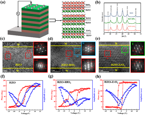 图1.三种结构的Hf0.5Zr0.5O2基薄膜电容器设计示意图、GIXRD图谱、TEM和PFM测试图