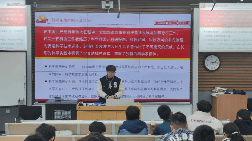(通讯员 张国翔)为传承与弘扬科学家精神,11月25日,先进材料与纳米科技学院应用化学系研究生党支部在南校区举办“时代之声-弘扬科学家精神”主题宣讲活动。本次活动聚焦“航天精神的时代价值”与“纳米能源的创新探索”两大主题,通过讲述钱学森的报国事迹与王中林院士的科研历程,深刻阐释科学家精神的丰富内涵,共50余名党员和积极分子参加此次活动。