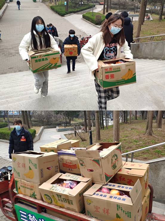 学生志愿者们“全人力”搬运、发放口罩、干粮、水果等物资,