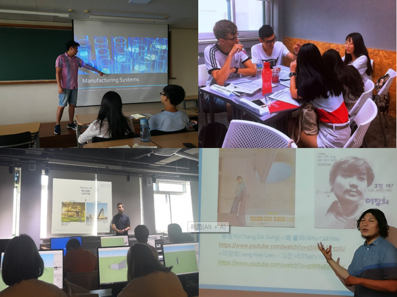 汉阳大学根据个人学习目标、兴趣爱好和专业背景的不同,设置了五个方向(Engineering、 Business、 Culture Contents、 Design、 Korean studies)的课程,参加项目的学生可以任选报一门课程进行学习。在Culture Contents 方向的Understanding K-Pop Industry课程上,IIdong Joe教授邀请了他的音乐人朋友,包括著名摇滚乐队主唱、SM公司员工等给同学们现场展示并普及韩国音乐目前的发展情况,并进行了三场专题讲座。Design 方向的Interior Design Project课程上,Minsoo Lee教授除了对建筑思路的讲解外,还指导学生运用专业软件进行建筑外围及室内装修设。授课教授包括汉阳大学商学院院长、音乐在线杂志“MUSIC”的主编、前美国知名高校教授、职业设计师及自由职业K-Pop音乐评论家。