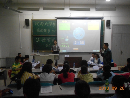 本次活动邀请院学生组织几位部长、副部长作为嘉宾。活动分为辩论赛环节,一站到底答题环节,和读书会读书感悟分享环节等活动。辩论赛在辩论部部长李天精辟流利的话语中开始,两队围绕“读书是否应该不求甚解”展开辩题,经过正反双方激烈的辩论,更好地树立了大家的读书观念。同时,双方奇妙的辩论艺术不时引起场下阵阵掌声。接下来“一站到底”环节将节目推向高潮,十四个小组竞相角逐,谁与争锋。经过激烈的对决,朱文龙与徐雨婷同学组依靠强大的知识储备毫无悬念争得桂冠。最后,大家快乐分享对“我的大学梦,我的读书梦”的读书心得。同学们的读后感中蕴含着他们的思考与感悟;凝聚着他们对读书的认真与执着;包含着他们对未来的期待与希望。其中穿插的文艺表演葫芦丝《月光下的凤尾竹》、二胡《赛马》博得满堂喝彩。本次主题团日在浓浓的书香氛围中圆满结束。