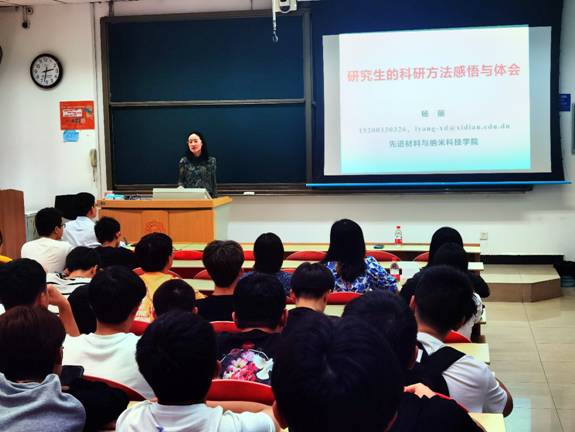 (通讯员 相盈如 刘男)担当时代责任,勇攀电子材料高峰。9月15日下午,先进材料与纳米科技学院在南校区信远楼117教室开展了材化菁英研途引航报告会暨研究生入学教育,学院执行院长、国家级领军人才、中国青年科技奖特别奖获得者杨丽教授与百余名研究生新生畅谈“科学研究的方法、感悟与体会”,报告会由学院党委副书记陈刚主持。