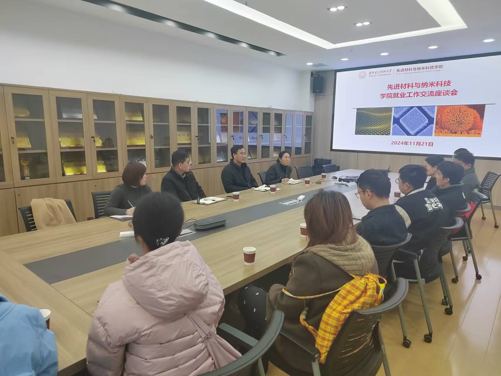 (通讯员  刘男)11月21日,先进材料与纳米科技学院在南校区举行就业交流座谈会,帮助毕业班学生更好了解当前就业形势,明晰自身职业定位,提升就业竞争力。学院党委书记宋刚锋、副书记陈刚、校就业指导服务中心研究生就业办公室主任詹奉珍、研究生辅导员刘男,以及十余名2025届研究生毕业生参加了本次座谈会,共话就业蓝图。