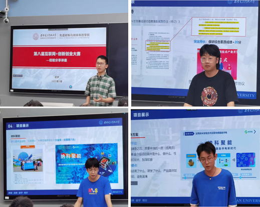 纪宁向大家分享了自己参赛的心得体会,从学习角度和发展角度深入分析了自己参与几次大赛的收获,以实际经历重点从项目通关经验和项目展示思路两方面进行了分享。吴振闻分享了他两次参加互联网+创新创业大赛的心路变化,从第一次的兴趣参与到第二次团队核心主力的个人成长角度讲述了参加创赛的经验。他还为同学解读了学校和国家的相关政策,为同学们介绍一些参赛的技巧。邱嘉俊从学校政策、制度和参赛流程的角度进行了分享。而张殊诚则从一个完整的申请项目角度,全流程地展示了自己参加第七届中国国际“互联网+”大学生创新创业大赛金奖项目“纳科聚能——纳米发电机开启传感器自供电新时代”,分别从行业分析、项目初心、核心技术、解决方案、产品落地、商业模式、融资需求等各个过程分享了经验。四位同学分别从不同方面分享了参加 “互联网+”大学生创新创业大赛的竞赛经历和感想,鼓励学弟学妹积极借助大学生创新创业训练计划项目平台,大胆尝试,勇于创新,将创新创业理念与专业学习深度融合,在指导老师、校友和学校的培养和帮助下,积极参加各类创新实践活动,团结协作、共同努力,不断打造和完善作品,再提升自我研究和创新能力的同时,努力取得优异的成绩。