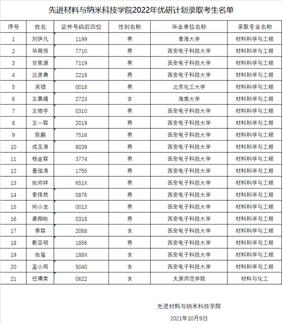 先进材料与纳米科技学院2022年优研计划录取考生名单